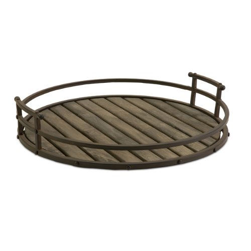 - Specifications: large sized decorative tray measures 20.75 in. in diameter. Featuring both side handles, wooden tray simplifies serving. Round in shape, surrounded by iron and wooden separations, serving platter is handcrafted with exemplary details