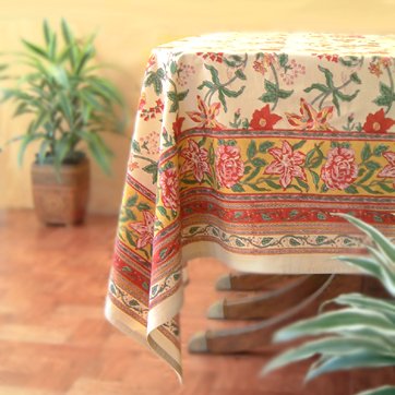 - Beautiful one of a kind tablecloth, yet utilitarian. Camouflages stains well and offers an exotic canvas for many memorable meals.